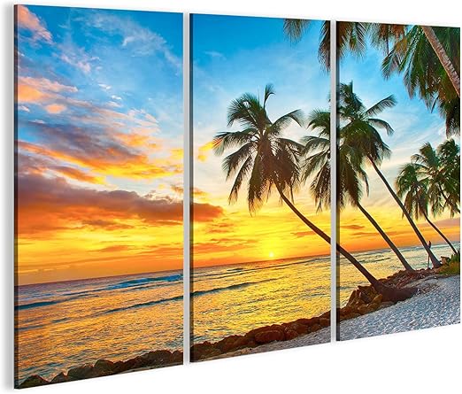 Bild Bilder Auf Leinwand Schoner Sonnenuntergang Uber Dem Meer Mit Blick Auf Palmen Am Weissen Strand Auf Einer Karibikinsel Von Barbados Wandbild Poster Leinwandbild Kjb Amazon De Kuche Haushalt